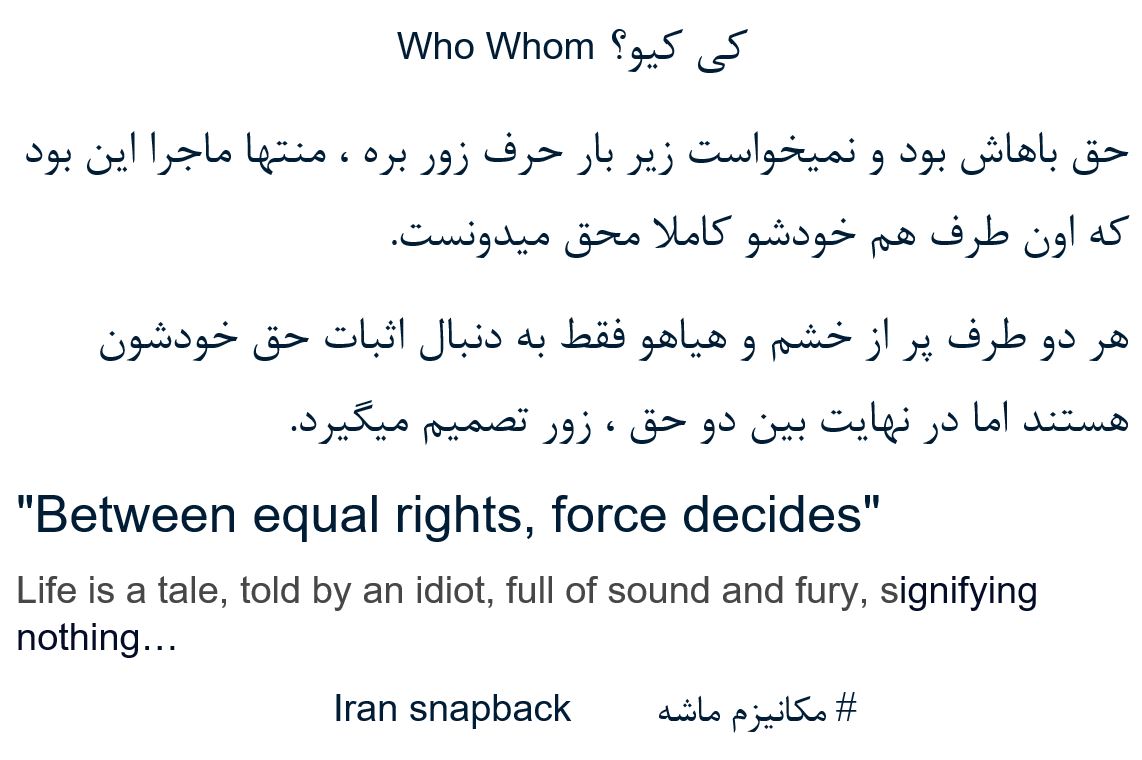 در این روز ها ما شاهد بحث مکانیزم ماشه و نوع دیگری از تقابل از برخورد بین دو حق نیز هستیم یکی حق داشتن هسته ای و دیگری صدایی که خود را محق برای تحریم و جلوگیری دست یابی  طرف دیگر به هسته ای می داند.