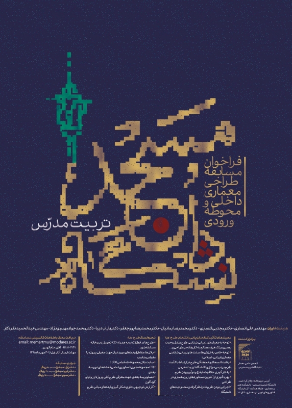 انجمن علمی دانشجویی معمار با همراهی دفتر فنی و عمران دانشگاه تربیت مدرس در نظر دارد به منظور تکمیل و بهبود طراحی معماری داخلی فضاهای شبستان های موجود و همچنین محوطه ورودی مسجد متناسب با شان و منزلت دانشگاه تربیت مدرس، مسابقه ای با شرایط ذیل و با هدف انتخاب طرح های برتر جهت اجرا در آینده برگزار کند. بدین منظور از کلیه دانشجویان و اساتید معماری، طراحی و شهرسازی و سایر علاقمندان دعوت می‎شود جهت شرکت در مسابقه مراحل ثبت نام را طی نموده و طبق برنامه زمانی مندرج در ذیل، براساس خواسته های موردنیاز طرح آثار خود را ارسال نمایند.