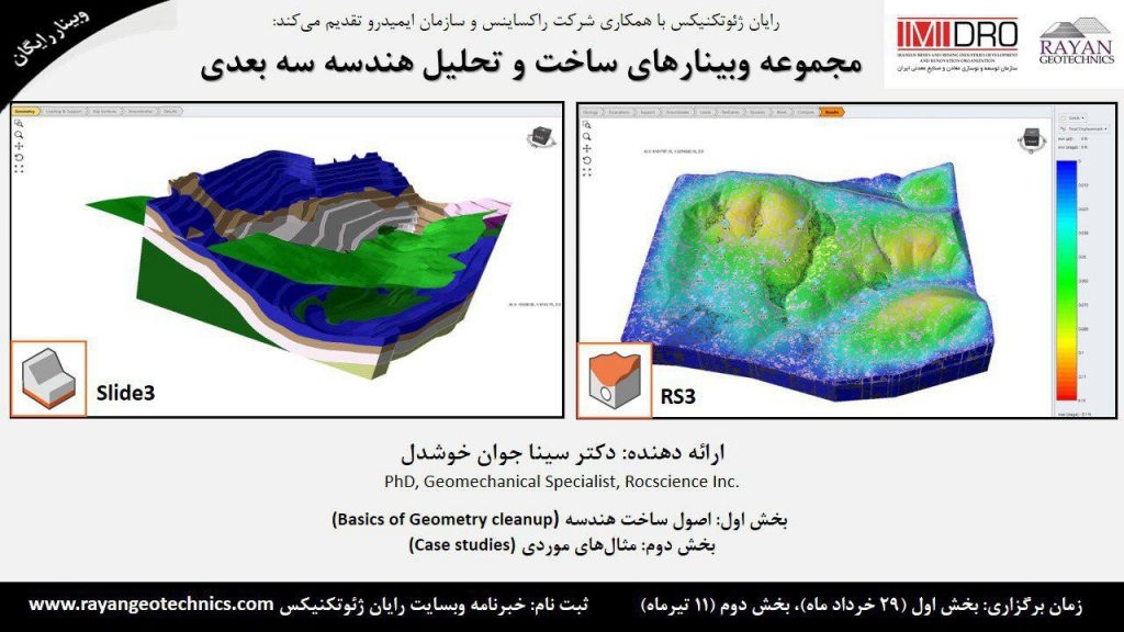 مجموعه رایان ژئوتکنیکس قصد دارد با مشارکت شرکت راکساینس کانادا و سازمان توسعه و نوسازی معادن و صنایع معدنی ایران (ایمیدرو)، دو وبینار رایگان کاملا تخصصی در زمینه ساخت هندسه مدل‌های سه بعدی با تدریس جناب آقای دکتر سینا جوان خوشدل برگزار نماید. اولین وبینار در تاریخ ۲۹ خرداد ۹۸ با موضوع “اصول ساخت هندسه (Basics of geometry clean up)” برگزار می‌گردد و بخش دوم این وبینار در تاریخ ۱۱ تیر ۹۸ با موضوع ” مدل سازی طیف گوناگونی از مثال‌های موردی” با نرم افزارهای سه بعدی شرکت راکساینس برگزار خواهد شد. جدیدترین قابلیت‌های مدل سازی هندسه در نرم افزارهای Slide3 2019 و RS3 2019 در این دو وبینار به صورت کامل بررسی می‌گردد و روند تحلیل مدل‌های هندسی با حل موارد صنعتی در این دو وبینار به صورت کامل برای علاقه مندان به نرم افزارهای شرکت راکساینس ارائه خواهند شد.