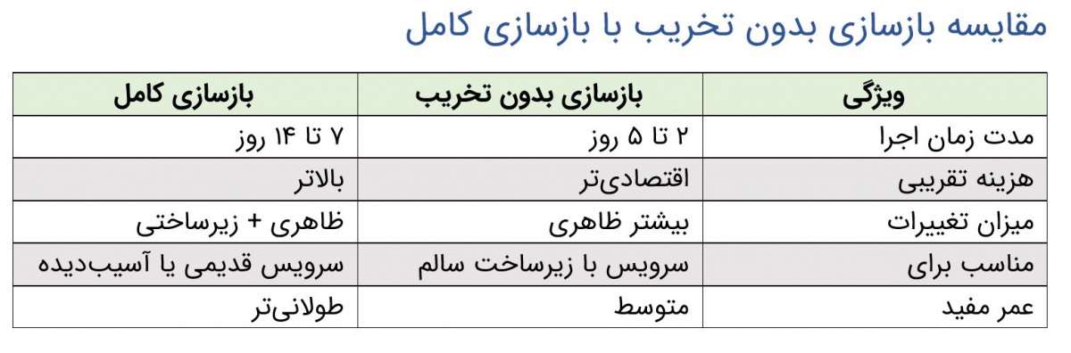 در این روش به جای تخریب کامل دیوار و کف، بخشهای اصلی دستنخورده باقی میمانند و تغییرات روی سطح یا تجهیزات اعمال میشود. مهمترین اقداماتی که در بازسازی بدون تخریب انجام میشوند عبارتند از: