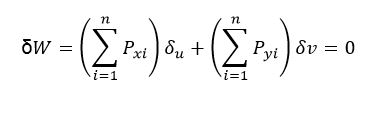 چون تغییر مکان مجازی ∆δ دلخواه است، مولفه‌های آن یعنی uδ و vδ باید مستقل باشند. بنابراین برای اینکه wδ مساوی صفر شود؛ باید ضرایب uδ و vδ صفر باشند. بنابر این می‌توان عکس کار مجازی را به صورت زیر بیان نمود:
