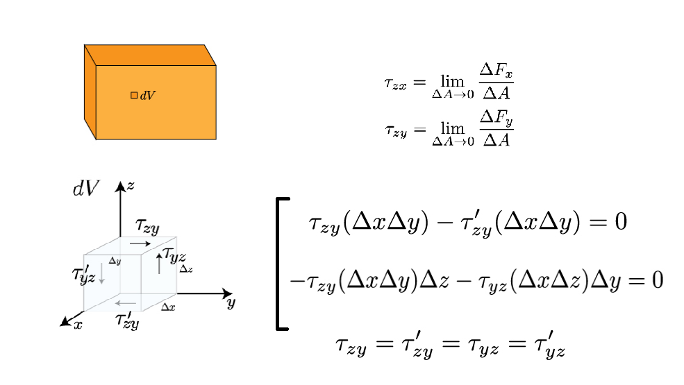 برای تنش برشی نیز از رابطه ی زیر استفاده میشود. باید توجه شود تنش محاسبه شده تنش متوسط است و به صورت یکتواخت در تمام سطح جانبی توزیع شده است. تصور تنش برشی در کل جسم کمی پیچیده است برای باز شدن موضوع  المان کوچکی از جسم که تحت نیروی برشی قرار گرفته با توجه به شکل زیر در نظر خواهیم گرفت. با توجه به رابطه تعادل نوشته شده در راستای X و Y و فرضیات موجود، تنش برشی در تمام جهات برابر خواهد بود که این این رابطه به عنوان برش خالص معروف است.